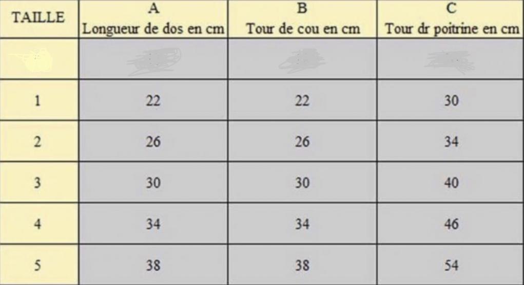 si vous avez vetement qui va à votre chien prendre couture du col jusqu au bout du manteau côté dos pour la longueur et pour la poitrine posez bien à plat le manteau et prenez sous patte gauche jusque droite et multipliez par deux